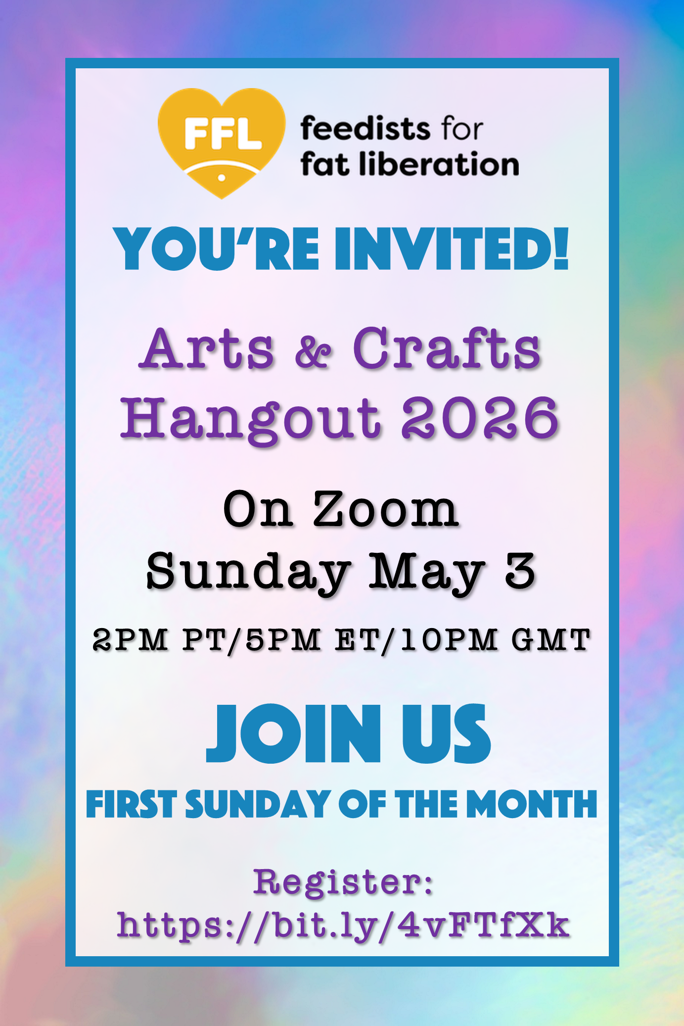 Please join Feedists for Fat Liberation’s Arts and Crafts Hangouts! These informal events are to work on our own arts and/or crafts projects together over Zoom. We can share the joy of creation during these troubling times for about an hour and a half. In 2026, our goal is to have one every first Sunday of the month at 5pm eastern time.