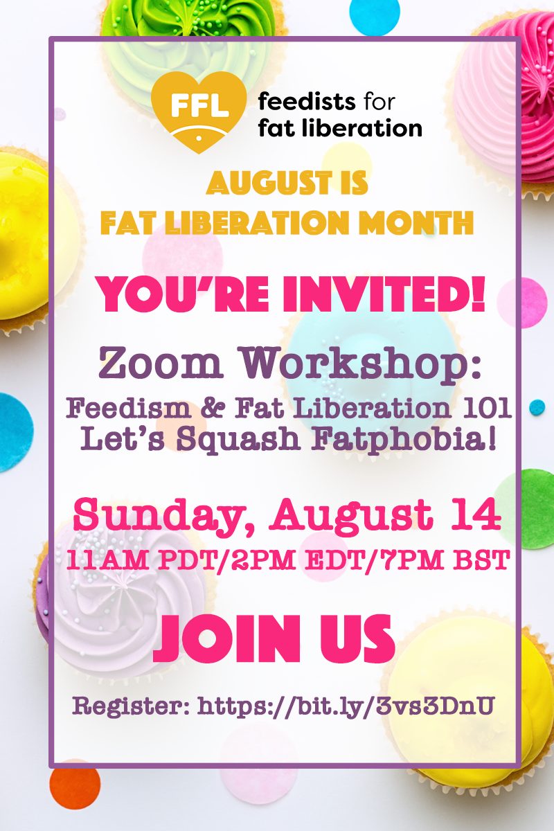 Join Feedists for Fat Liberation for a Zoom workshop, “Feedism & Fat Liberation 101: Let’s Squash Fatphobia.” Sunday, August 14, 11AM PDT/2PM EDT/7PM BST. This is a great opportunity to learn more about feedism, fat lib, and the connections between the two. Talk to community members and explore fat liberation within the feedist community and