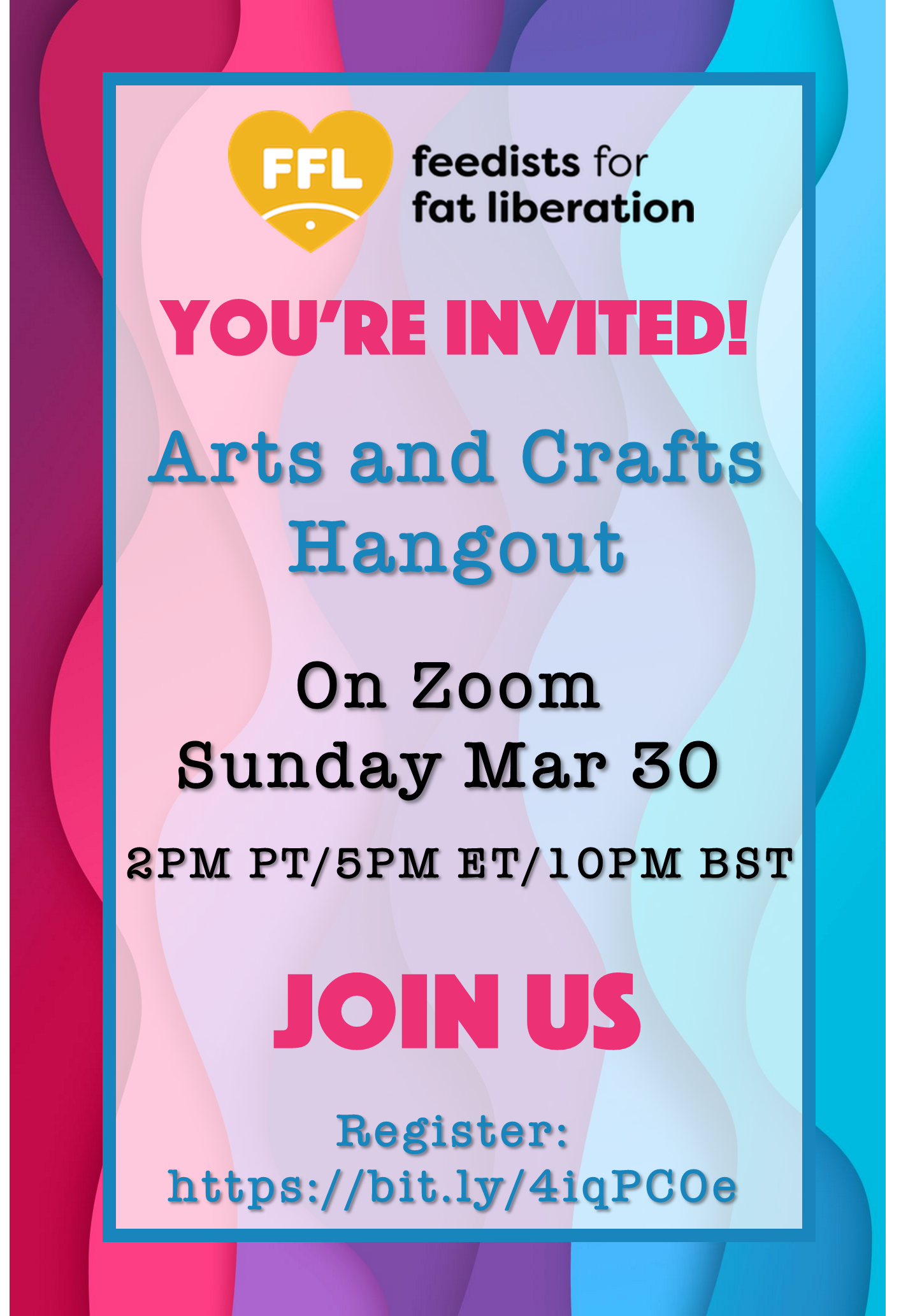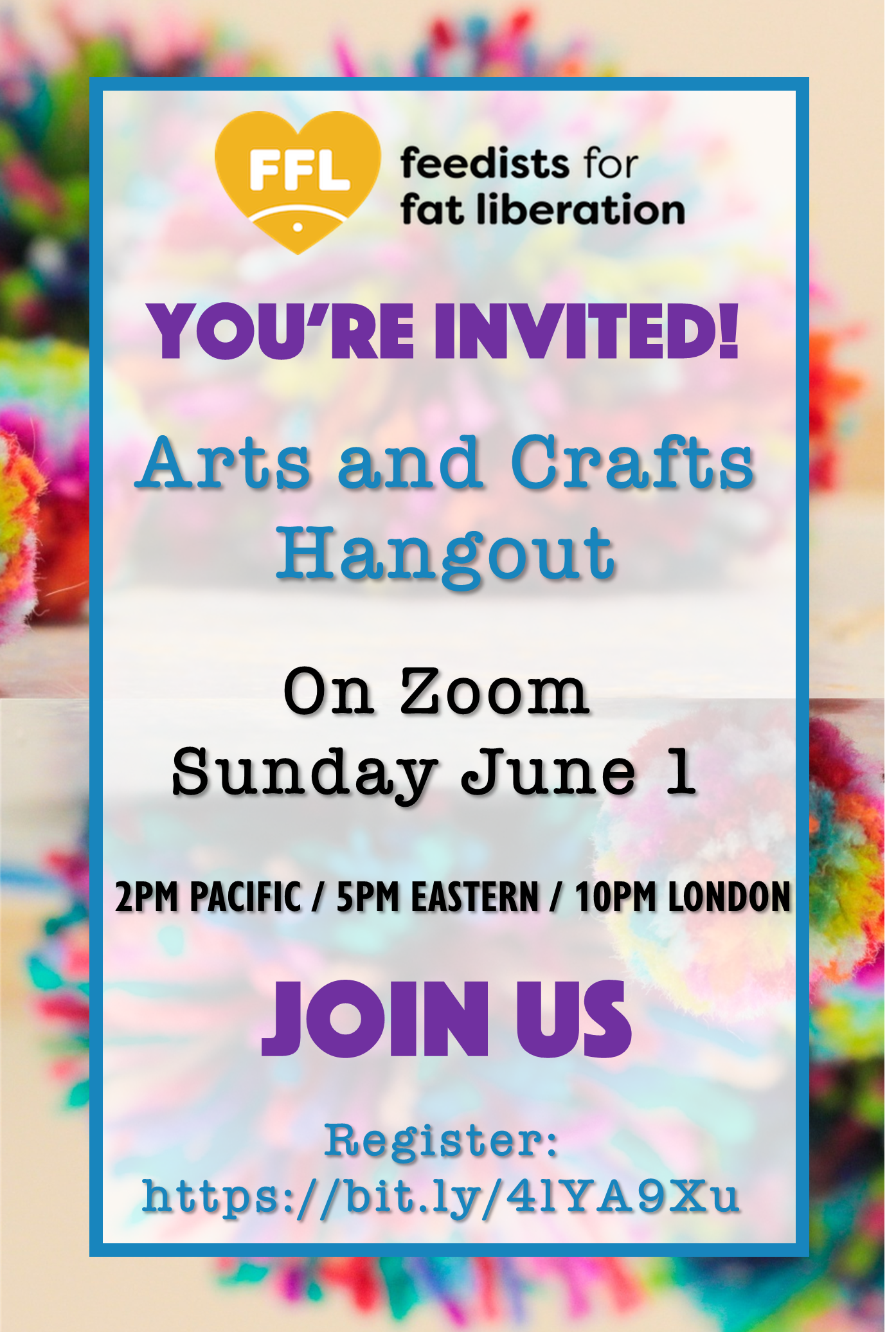 Join us for FFL’s Arts and Crafts Hangout on Sunday March 30 at 2:00 p.m. PDT, 5:00 p.m. EDT, and 10:00 p.m. BST. This informal event is to work on our own arts and/or crafts projects together over Zoom. We can share the joy of creation during these troubling times. Register here: https://bit.ly/4iqPC0e