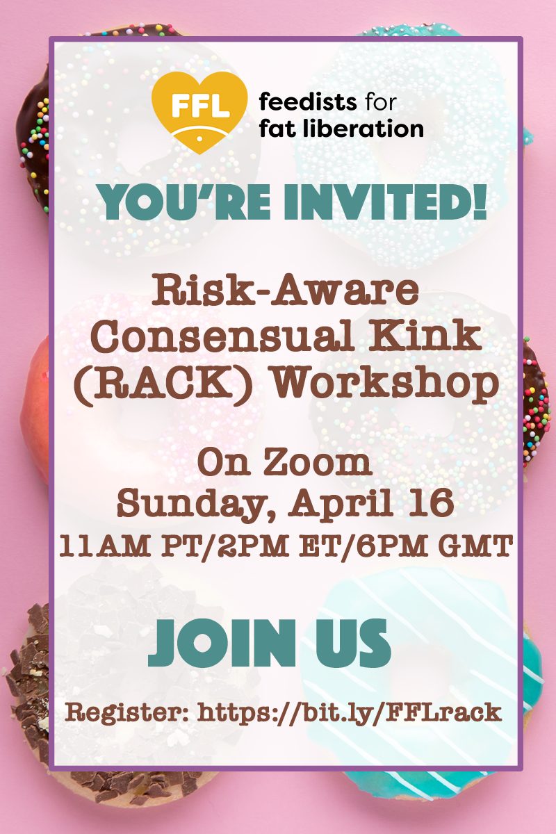 Join Feedists for Fat Liberation for an Online Risk-Aware Consensual Kink (RACK) Workshop! Understand risk awareness as it relates to feedism and how to develop your own risk profile. Then, learn how to incorporate ongoing consent and negotiation into your feedist relationships. Sunday, April 16, 2023, at 11AM PT/2PM ET/6PM GMT. Register here: https://us06web.zoom.us/meeting/register/tZAtceqhrDkvE9ez95CBskz_WONUhitPFBDa