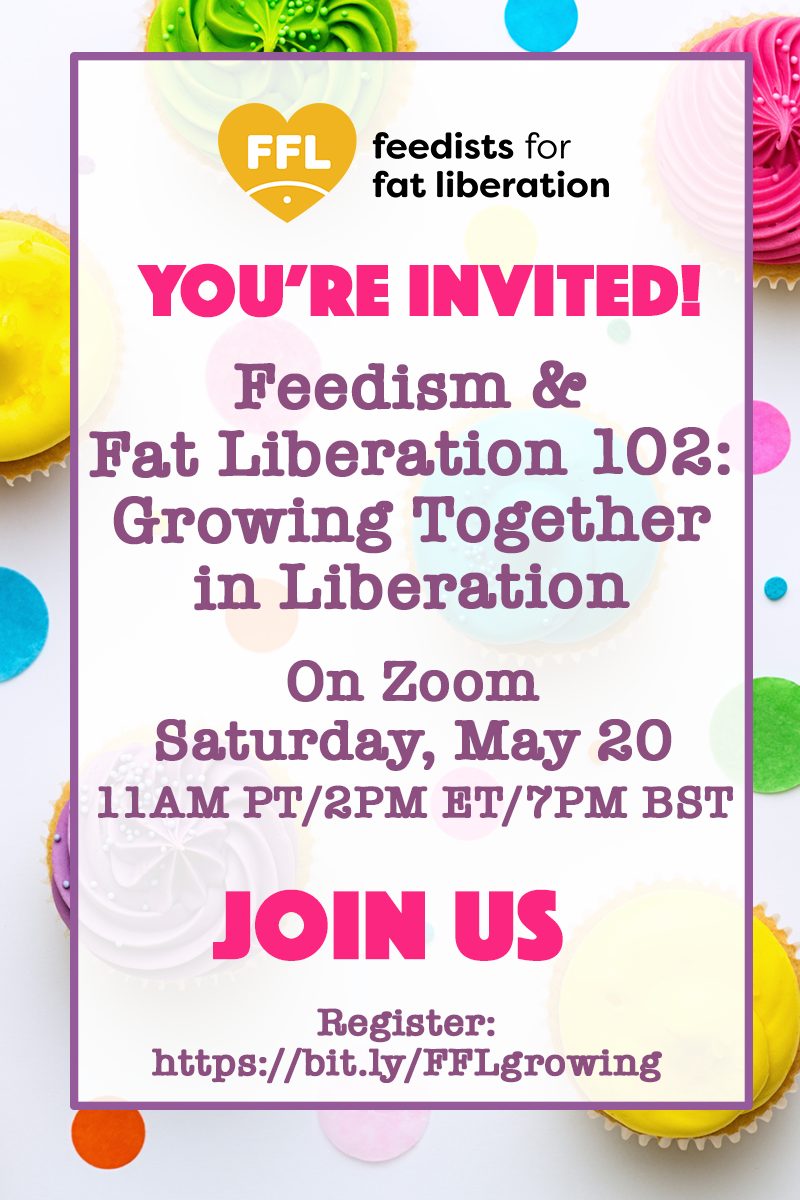 Join Feedists for Fat Liberation for a Zoom workshop, “Feedism & Fat Liberation 102: Growing Together in Liberation.” Saturday, May 20, 11AM PT/2PM ET/7PM BST. This is a great opportunity to learn more about feedism, fat lib, and how different forms of oppression intersect with each other and with anti-fat bias. Talk to community members